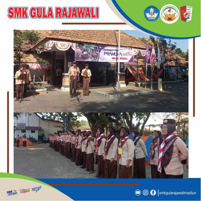 siswa-siswi SMK Gula Rajawali Madiun dengan mengenakan pakaian Pramuka lengkap.