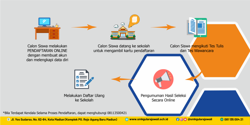 1. Calon siswa melakukan PENDAFTARAN ONLINE dengan membuat aku dan melengkapi data diri pada Link SPMB 2026/2027 2. Pengumuman Hasil Seleksi Secara Online 3. Melakukan Daftar Ulang ke Sekolah